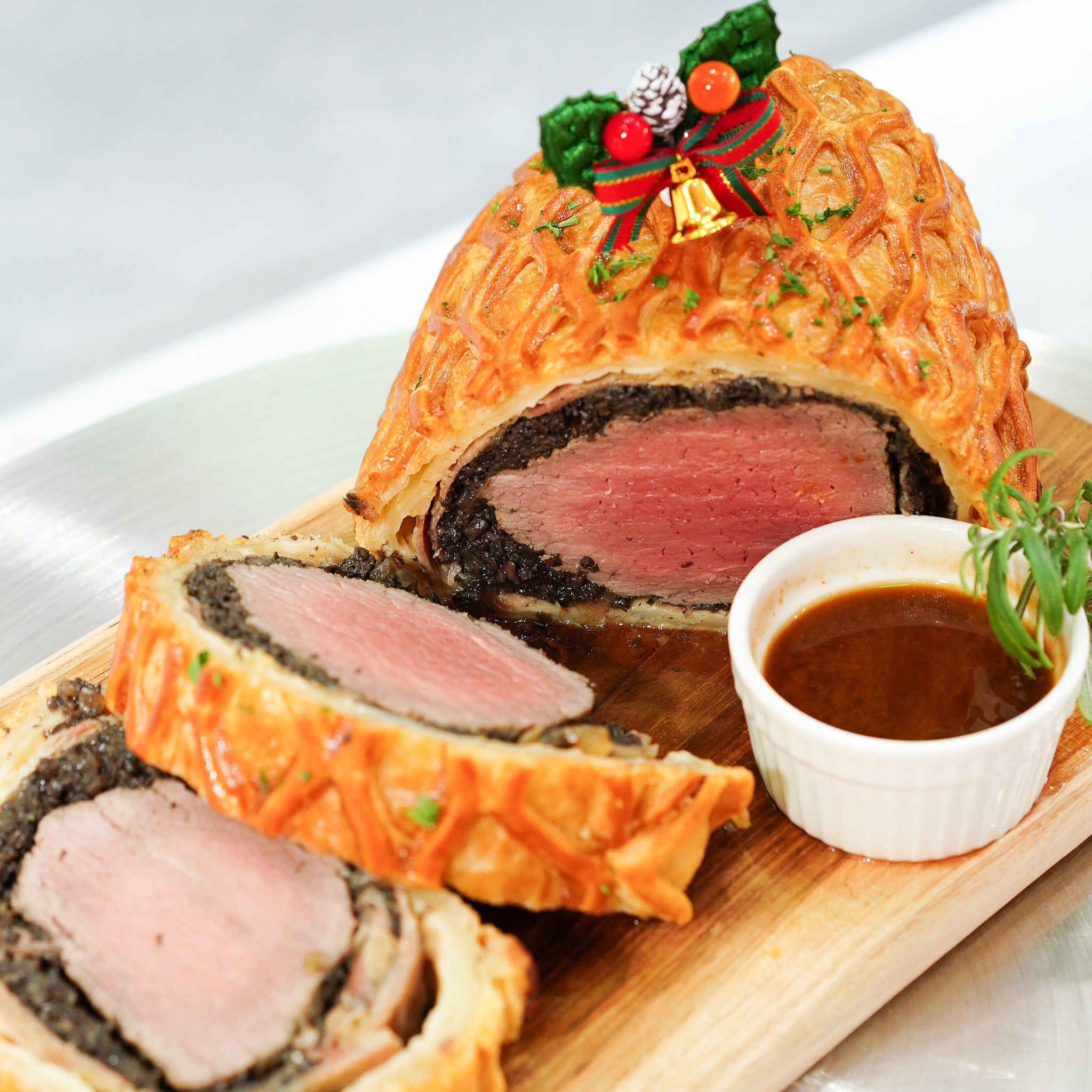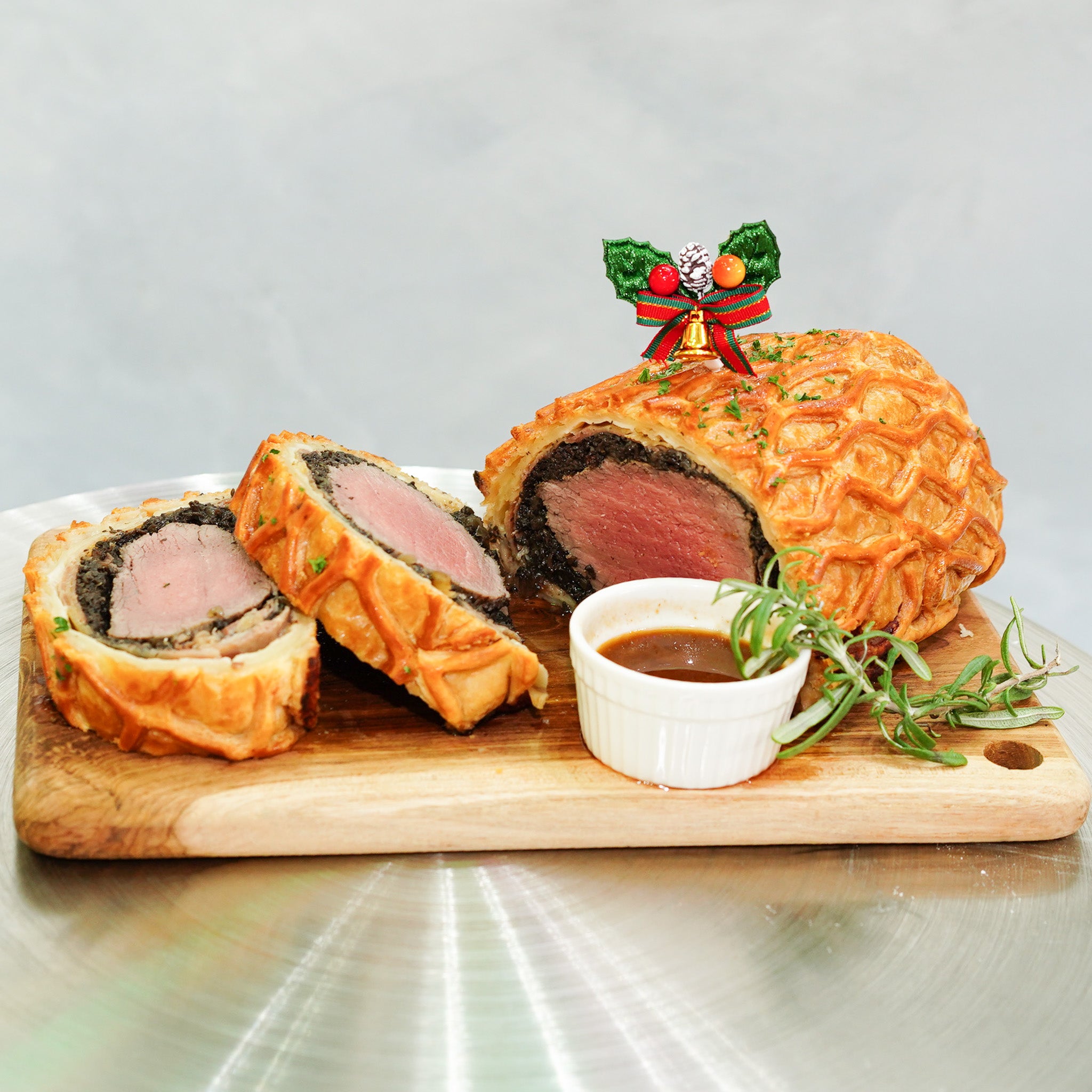 Juicy, tender tenderlion beef wrapped in slow cooked mushroom confit, layered with Parma ham we slice in-house from a whole leg of ham, and sealed in rich, buttery pastry — all handcrafted with love. Includes Festive Vegetables.